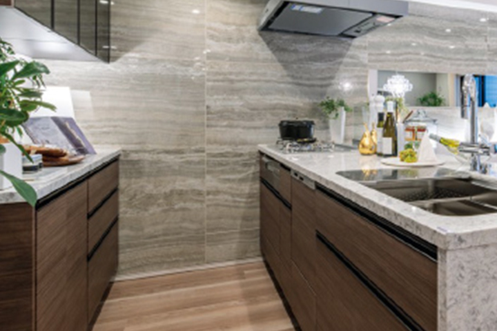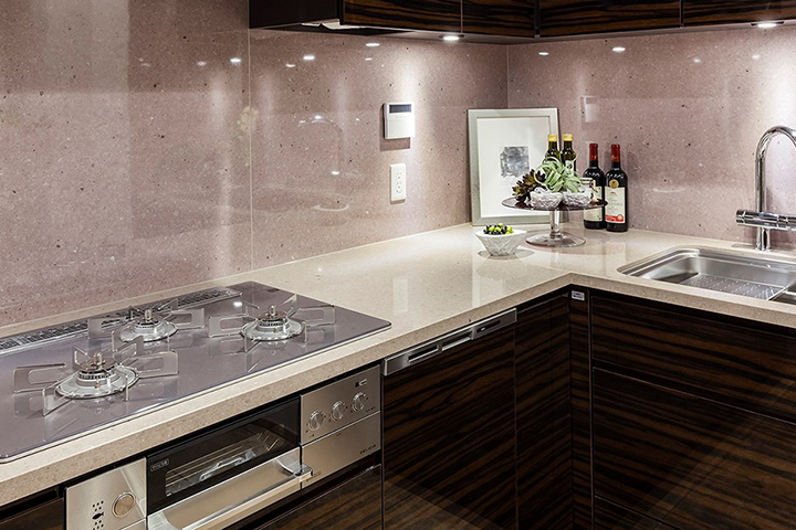 継ぎ目のない一体成形で加工がしやすく、デザインの自由度が高いことが特徴です。キズや汚れに強く、メンテナンスが容易なため、美しさと高い耐久性を両立しています。