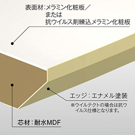 表面材にメラミン化粧板を使用したカウンター。合板・耐水MDFなどの基材に接着剤を塗布し、メラミン化粧板に熱・圧力をかけ、基材形状に合わせて成形したカウンターです。