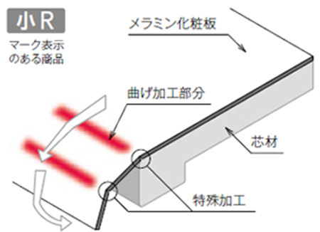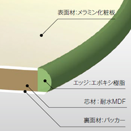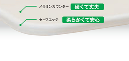 平面形状の自由度が高いメラミン化粧板貼りエッジ塗装のバリューエッジカウンター。平面部にはメラミン化粧板を、エッジ部は樹脂を流し込み硬化後、削り出し加工したステレオエッジカウンター。平面部はメラミン化粧板を、エッジ部は打込み中空樹脂エッジを採用したセーフエッジカウンターの3つのRスタイルカウンター。