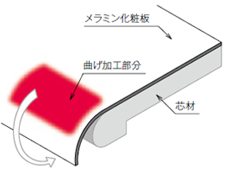 合板・耐水MDFなどの基材に接着剤を塗布し、メラミン化粧板に熱・圧力をかけ、基材形状に合わせて成形する加工技術ポストフォーム。堅牢さ、メンテナンス性、清潔さなどメラミン化粧板の優れた物性が、ポストフォームカウンターの特長です。